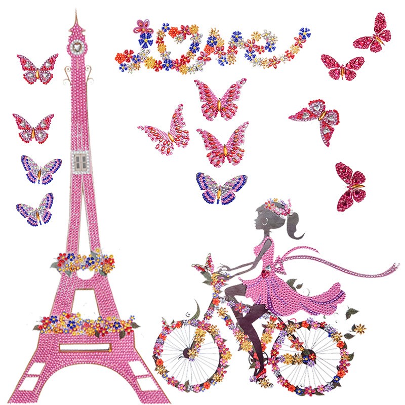 Vægsticker med Eiffeltårnet er en perfekt tilføjelse til dit hjem eller cykelrum. Den indeholder et smukt motiv af Eiffeltårnet og en kvinde på cykel i lyserøde nuancer. Klistermærkerne leveres på et samlet ark med påtrykt lim, hvilket gør det nemt at anvende.